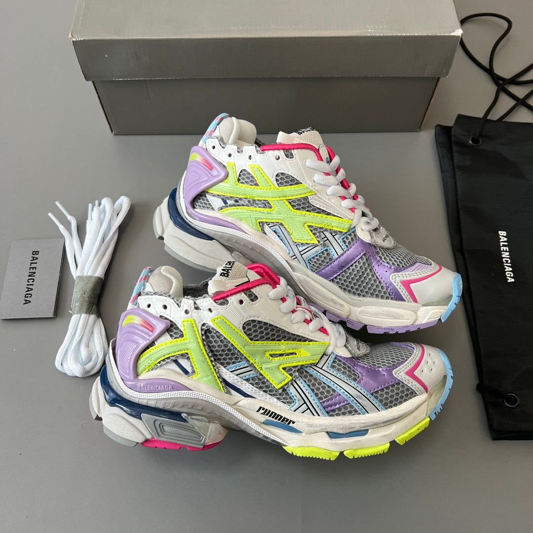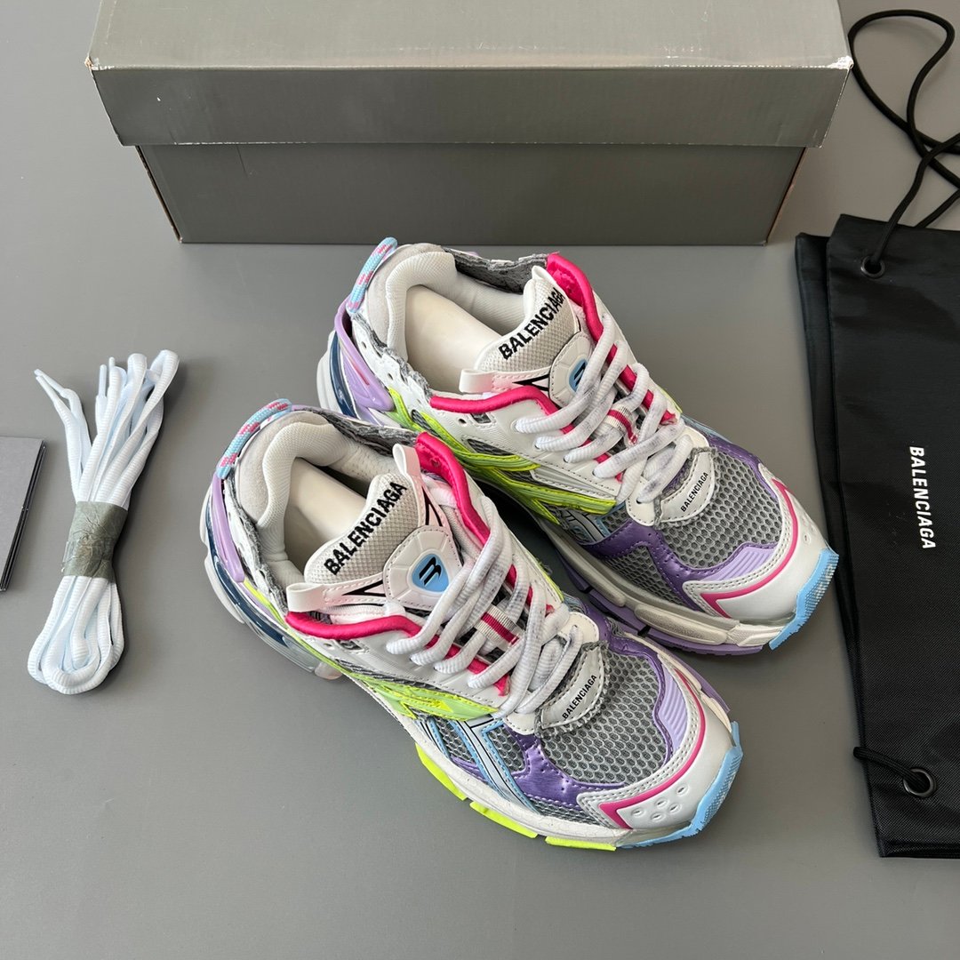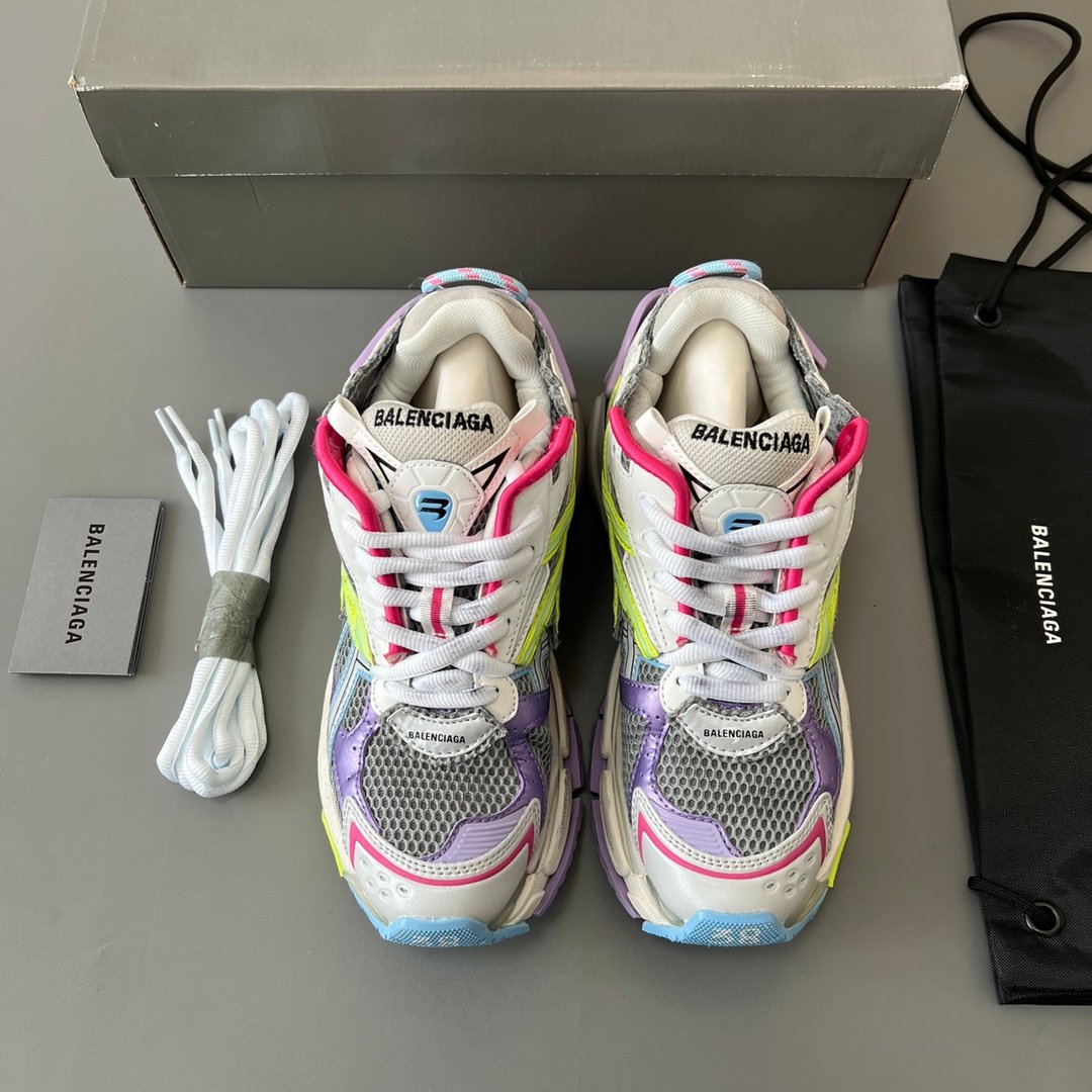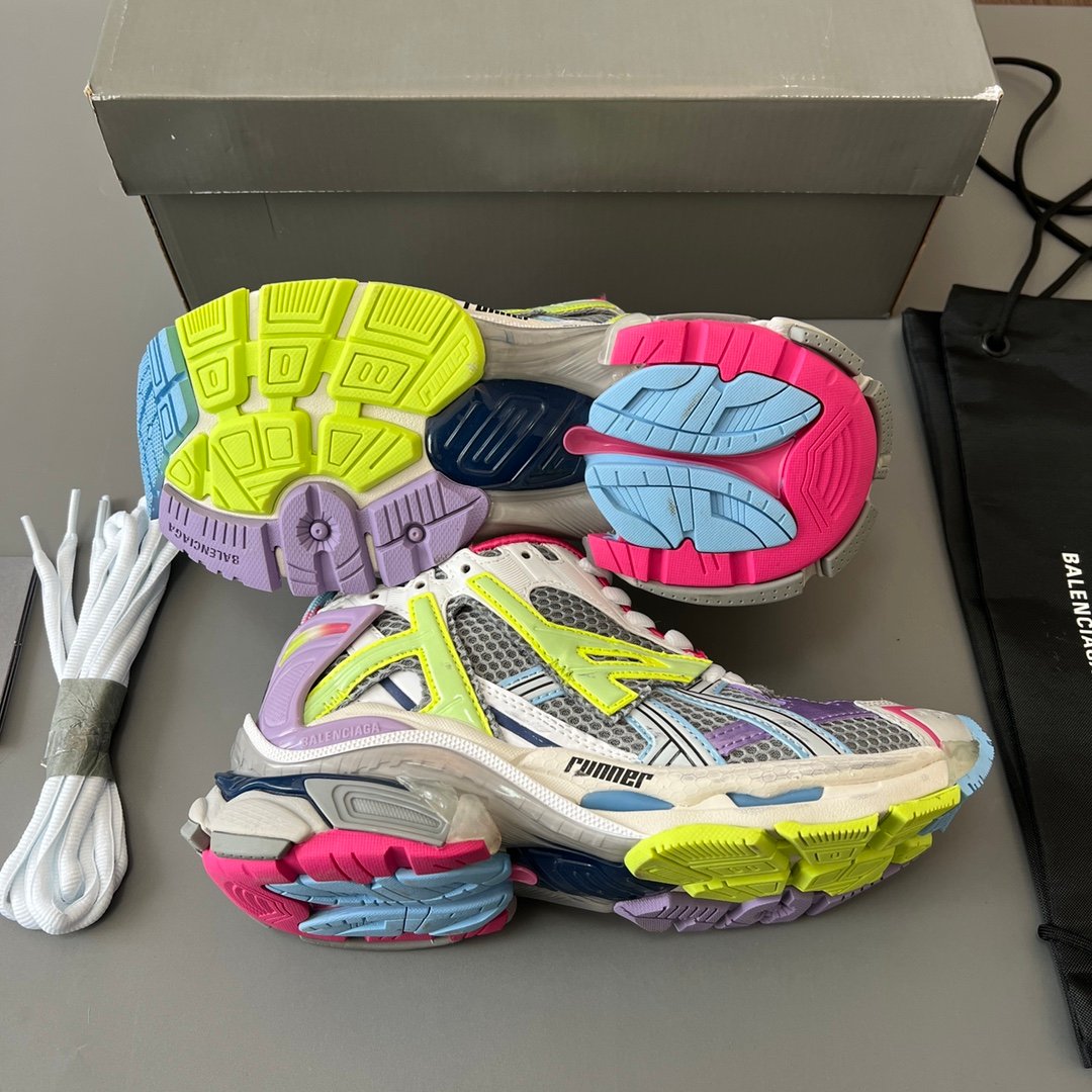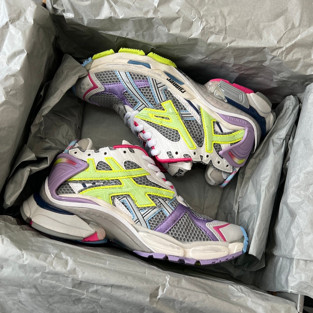 The shoe features a layered, multi-panel upper with breathable mesh, synthetic overlays, and a striking mix of pink, yellow, purple, and blue accents. Accented with the Balenciaga logo on the tongue, a chunky sculpted midsole, and a rugged lugged outsole, it delivers head-turning, high-end style.