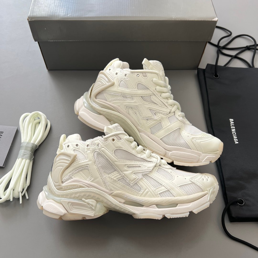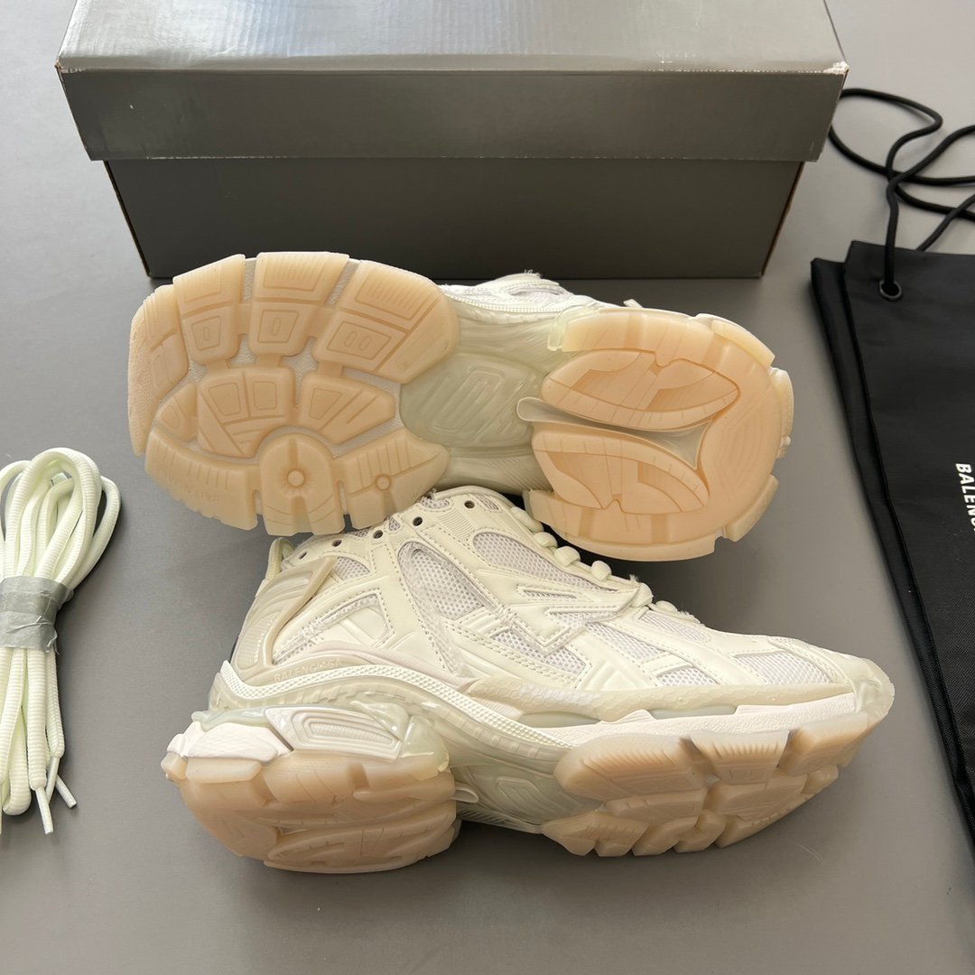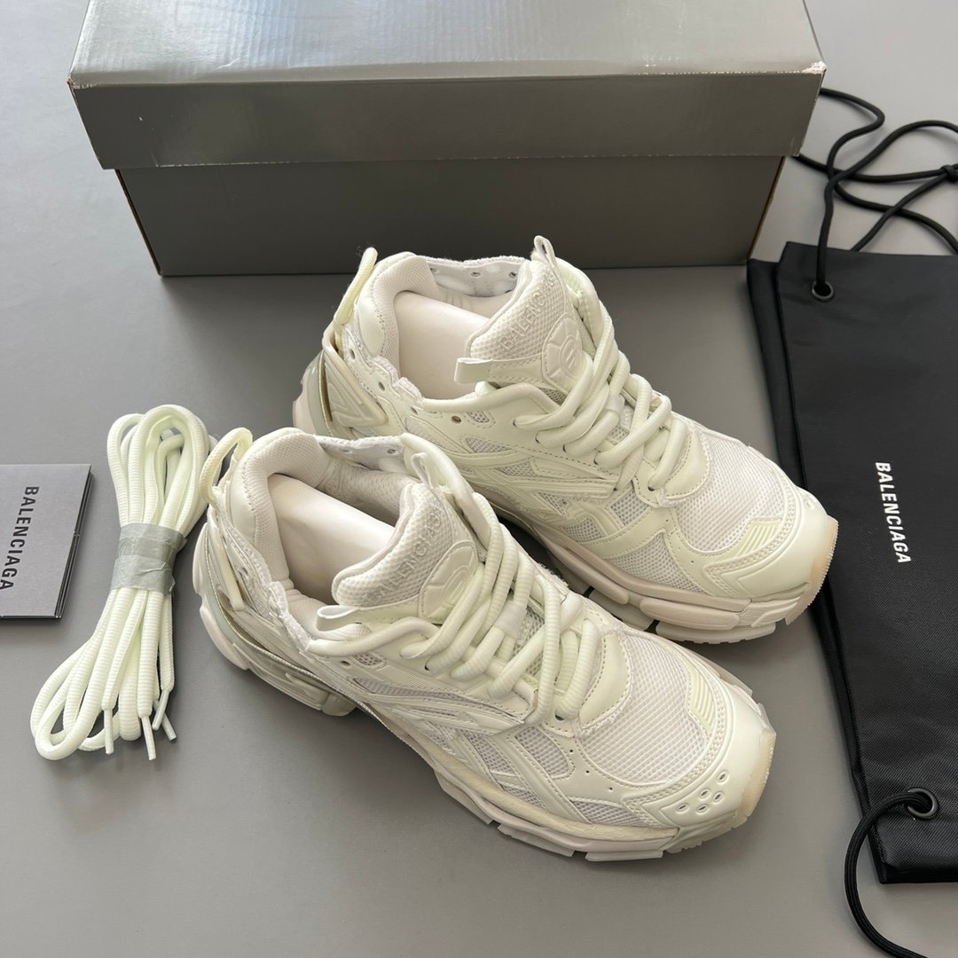 The shoe features a layered, multi-panel upper with breathable mesh, synthetic overlays, and a striking monochromatic triple white design. Accented with the Balenciaga logo on the tongue, a chunky sculpted midsole, and a rugged lugged outsole, it delivers head-turning, high-end style.