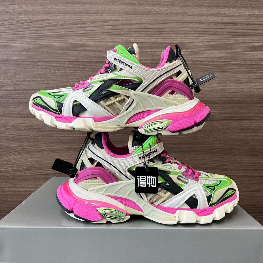 Elevate your streetwear game with the Balenciaga Track Sneaker in a bold pink, neon green, and crisp white colorway. This high-performance sneaker continues the legacy of Balenciaga’s chunky aesthetic, blending high-fashion design with the functional elements of hiking and running gear.